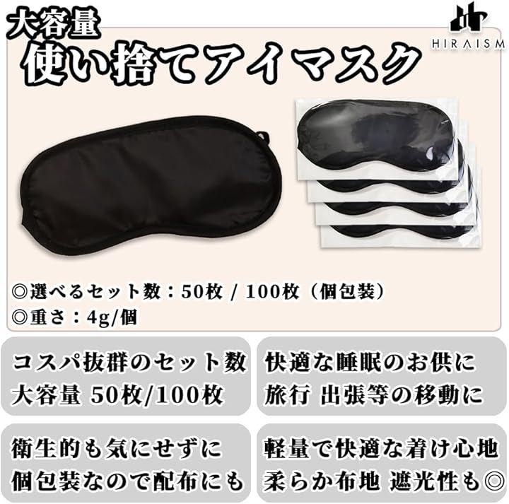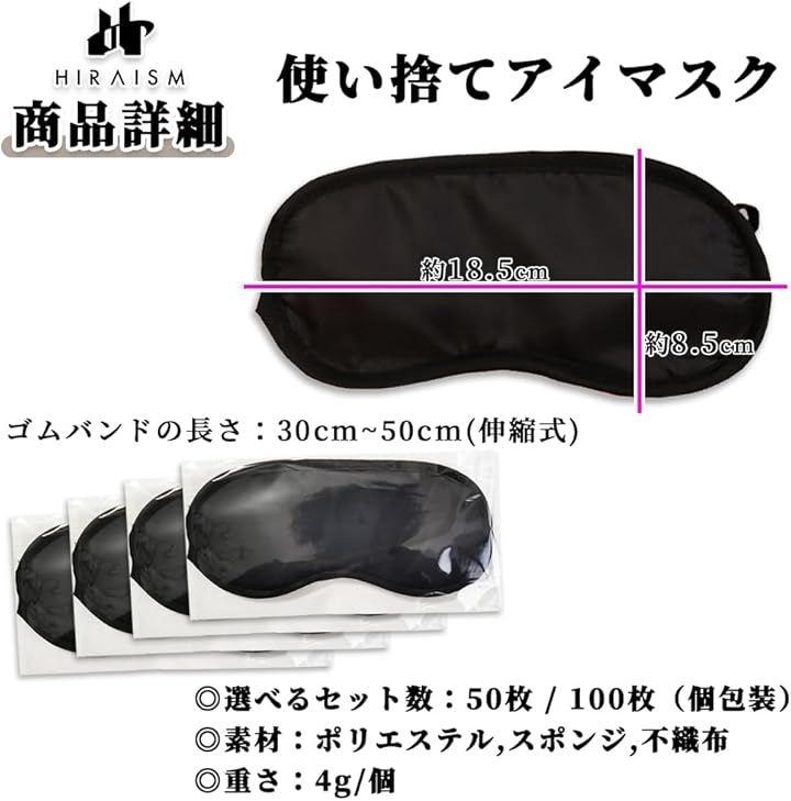 「商品内容」使い捨てアイマスク:50個 / 100個 サイズ:18.5x8.5cm ゴムバンドの長さ:30~50cm(伸縮) 重量:4g / 個 素材:ポリエステル、スポンジ、不織布 カラー:ブラック 備考:個包装