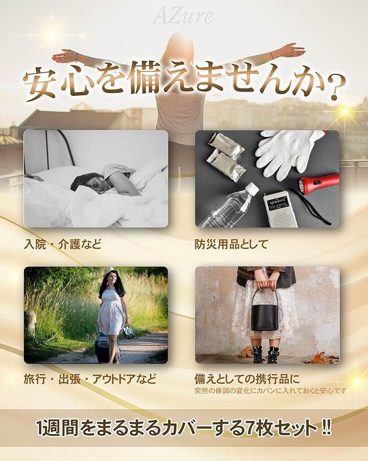 「様々なシーンで活躍。」主には旅行や出張・入院などに最適な商品ですが、その他にも妊娠中・産後・エステ・介護・防災用と幅広くお使い頂けます。