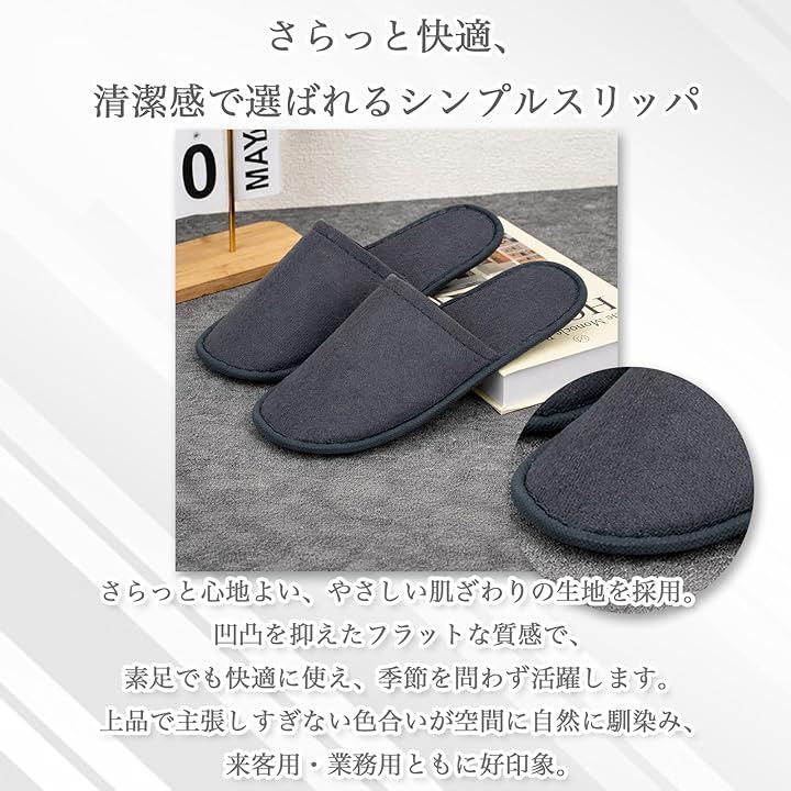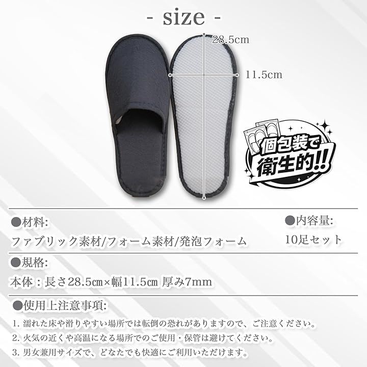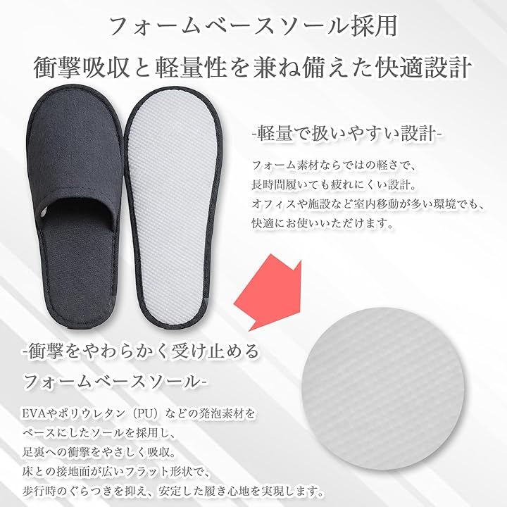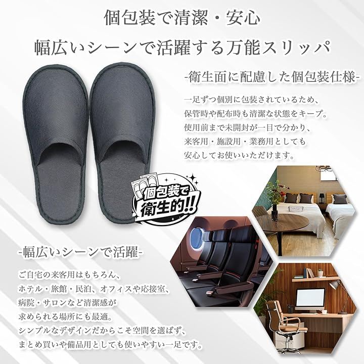 業務用としてホテル、旅館、民泊、エステサロン、モデルルームでの使用はもちろん、ご自宅の来客用や防災グッズ(避難所用など)、旅行用の携帯スリッパとしても最適な10足入りの大容量セットです。
