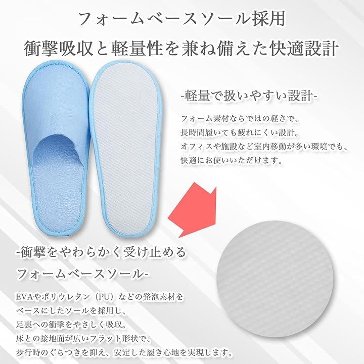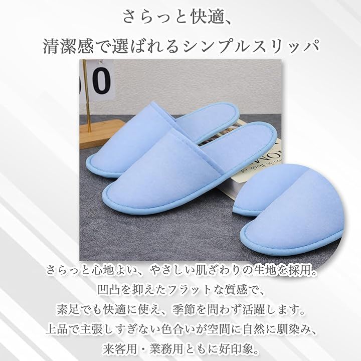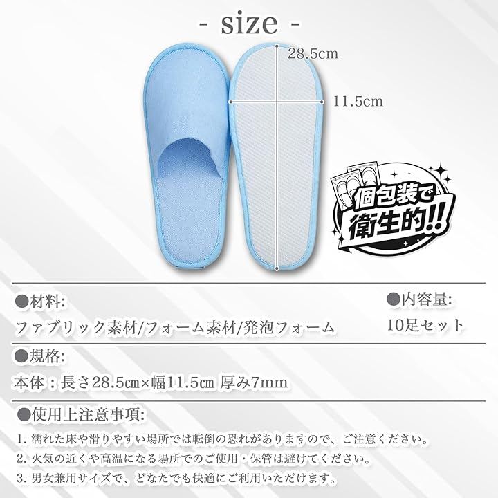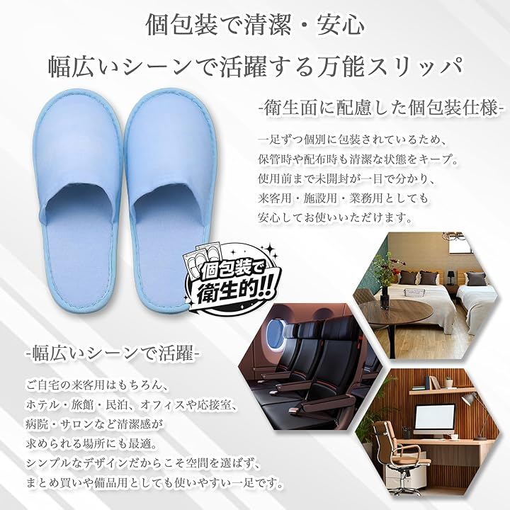 業務用としてホテル、旅館、民泊、エステサロン、モデルルームでの使用はもちろん、ご自宅の来客用や防災グッズ(避難所用など)、旅行用の携帯スリッパとしても最適な10足入りの大容量セットです。