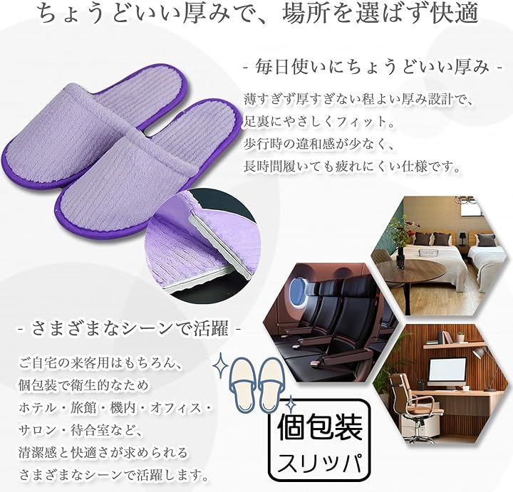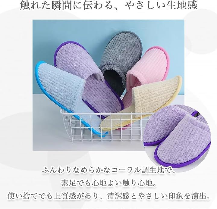 清潔感のある個包装で、使い捨てとしても利用しやすく、来客用・旅館・ホテル・民泊・オフィス・エステ・引っ越し・内装業など幅広いシーンで活躍します。