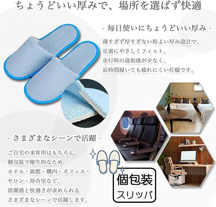 清潔感のある個包装で、使い捨てとしても利用しやすく、来客用・旅館・ホテル・民泊・オフィス・エステ・引っ越し・内装業など幅広いシーンで活躍します。
