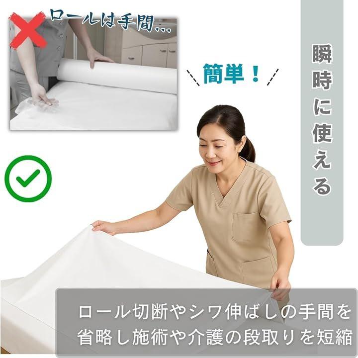 「瞬時に展開」折り畳み状態から広げるだけで120x200 cmの大判シーツがベッド全体を覆い、ロール切断やシワ伸ばしの手間を省略。
