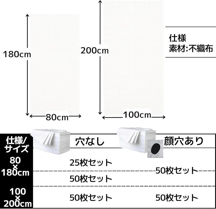 「仕様」サイズ:100x200cm、素材:不織布、カラー:ホワイト、数量:50枚セット