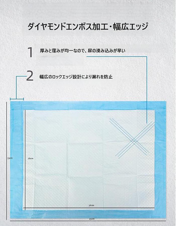 サイズ設計: 広めの面積で十分なカバー範囲を確保し、漏れを防止します「外寸:45cmx33cm 吸収部:38cmx28cm」