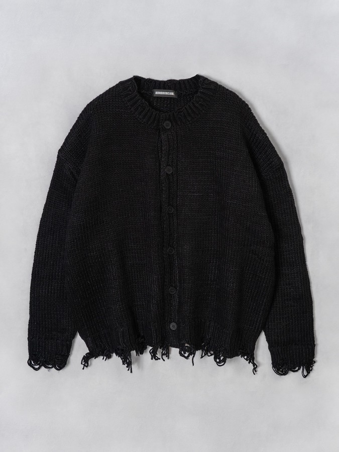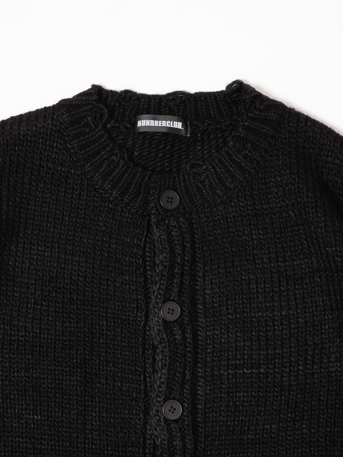 メンズライン「HUNDREDCLUB」のニットカーデ。程よいダメージ加工でジャンルを問わずコーデしやすいのが魅力♪肌触りがいいビスコースレーヨンと耐久性のあるポリエステルの混紡で吸湿性・保湿性も◎ビッグシルエットのアイテムとして女性にもおすすめです。