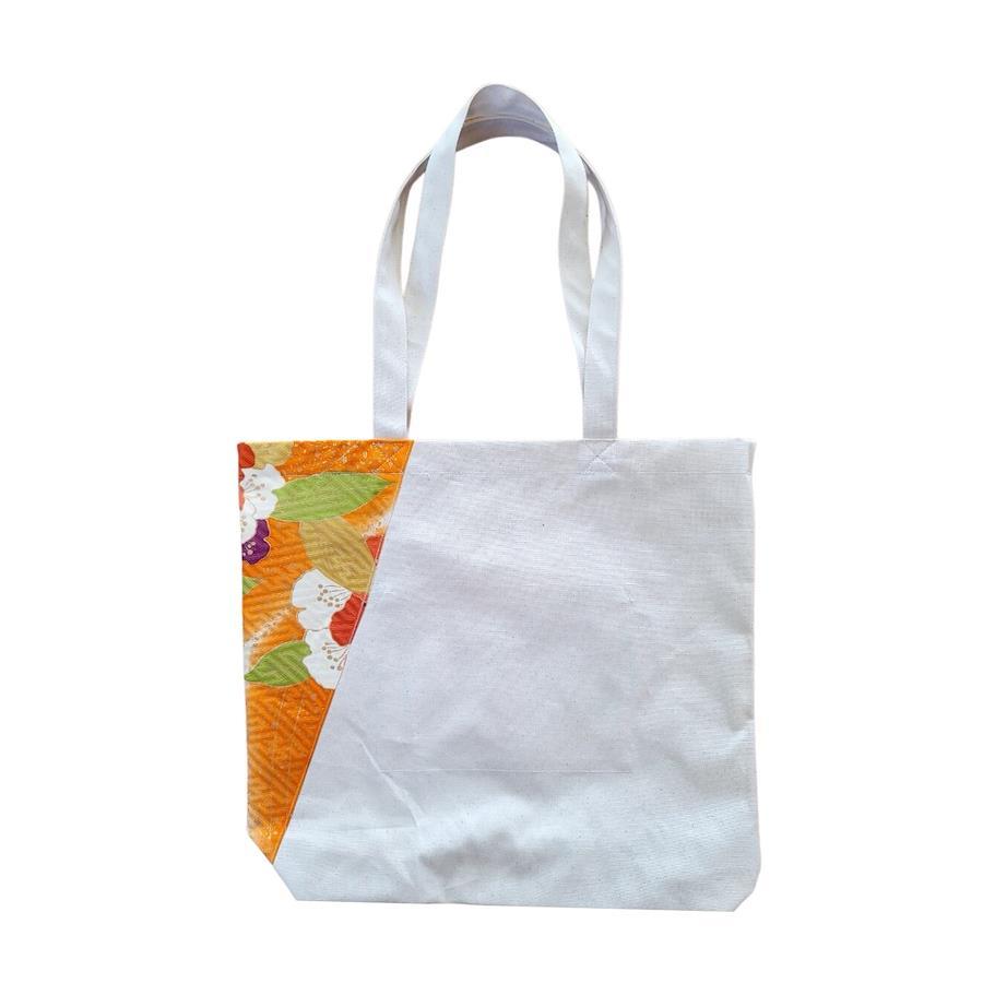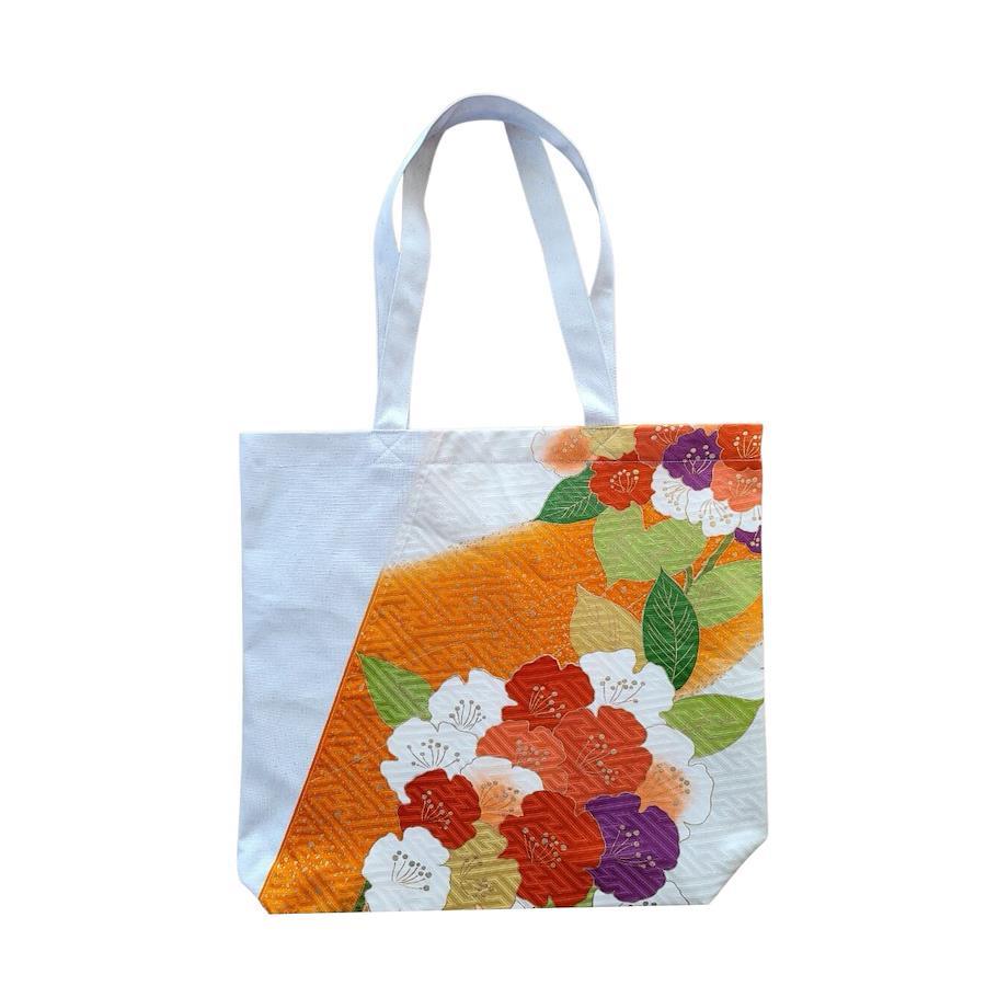 付下げを使用した薄いブルー系をベースとした帆布バッグ。ゴージャスな花が際立つ美しい一品になります。 素材/材質 :シルク100%(正絹)と帆布生地を使用しております。サイズ/寸法:縦:40cm 横:40cm マチ:8cm 持ち手:55cm注 意 :モニター発色の具合により色合いが異なる場合がございます。■着物生地から作ったオリジナルバッグ。■着物生地から作ったオリジナルバッグエコバックにも利用できるトートバッグになります。■着物ならではの色合いと高級感あふれる美しい一品になります。