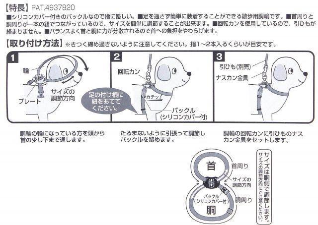 商品紹介シリコンカバー付きでバックル脱着時に指が痛くない原材料・成分ナイロン、シリコン使用方法胴輪の輪になってる方を首にかけもう一方を胴に回してとめて下さい。