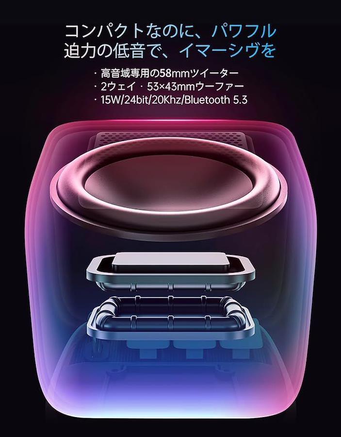 「小型でも迫力の重低音」15Wのパワーと高音質の58mmドライバーで、サイズ以上の重低音とクリアな広がりを再現。