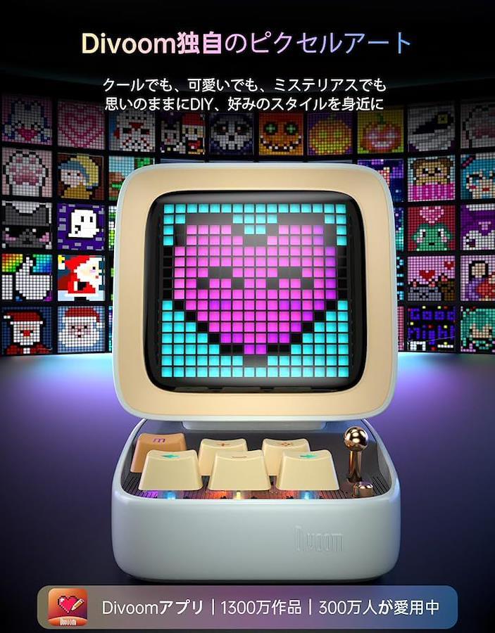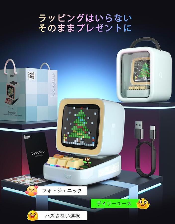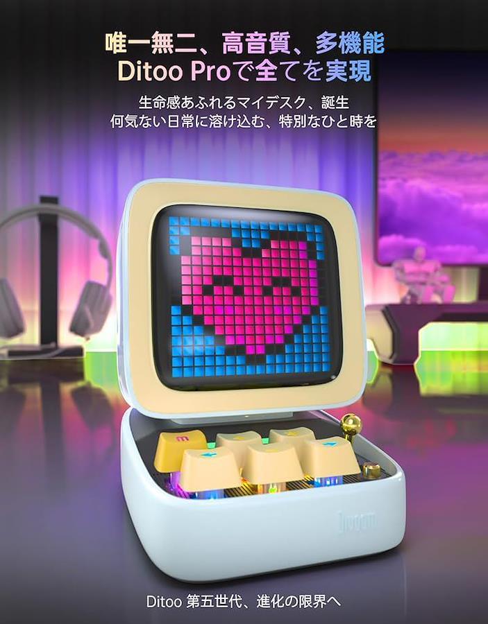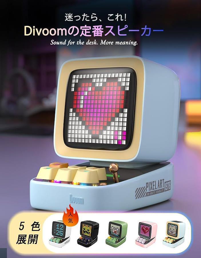 「部屋の雰囲気が「楽しく」変わる—ワイヤレススピーカー」ピクセルアート、面白いアニメーション、RGBライト、青軸キーなどを組み合わせたデザインが、置くだけでデスクやゲーミングに活気をプラス。