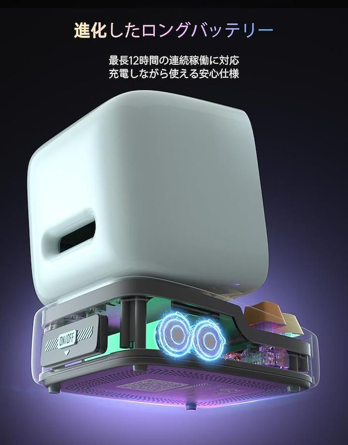 「最大12時間・充電しながら使用OK」5000mAhバッテリーで屋内外の長時間利用に対応。