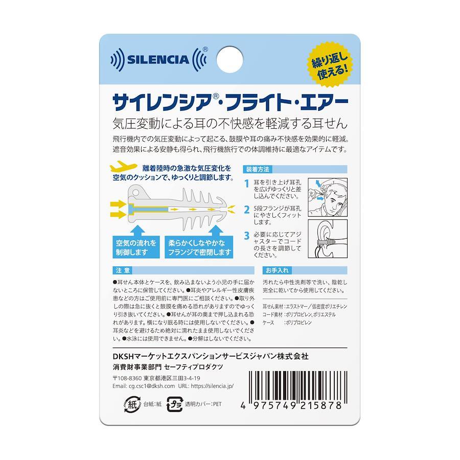 ●飛行機内での気圧変動によって起こる、鼓膜や耳の痛み不快感を効果的に軽減。●遮音効果による安静も得られ、飛行機旅行での体調維持に最適なアイテムです。●離着陸時の急激な気圧変化を空気のクッションで、ゆっくりと調節します。●空気の流れを制御します。●柔らかくしなやかなフランジで密閉します。●繰り返し使える!●長さを調節できるコード付き。 気圧コントロール機能付き、飛行機耳せん。気圧変動による耳の不快感を軽減する耳せん。