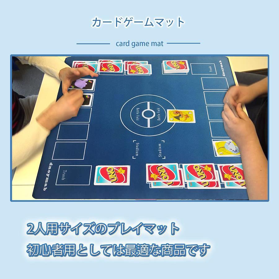 【材料】 プレイマットは表面/布製(水洗が可能)+裏面/ラバー素材(滑り止め効果があります)。本体のデザインはシンプルながらしっかりしており,マットの端はかがり縫いがしてあって高級感があります。カードゲームに使用できます。 【仕様】この プレイマット カードゲーム 2人用のサイズ 60×60cm、厚さ約3mm、重さ約700G。プレイマットとしてはしっかりした厚みで、クッション感があります,捲る時に沈むので爪でカードの端に傷をつけたりする可能性は減ると思います。対戦をする際に相手のカードを汚しにくくするため 【使用場合】屋外などメッシュテーブルを使う際には,サイズが小型のホームこたつに丁度良く非常に遊びやすいです。パソコンの前に置いて、マウスパッドとして使うと反応が良くストレスなく使えたりしますよ。 【収納バッグ】ラバー カード マットは収納袋が付きます。持ち運びや収納がとても便利です。友人宅で遊びたり外出する時に快適でゆっくりマットを持ち運ぶことができます。 【ご注意点】カード プレイマットは少し匂いのある場合があります,使う前に風通しの良い所に2日くらい放置した方がいいですね。