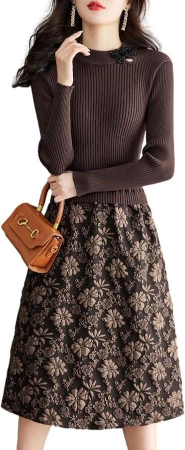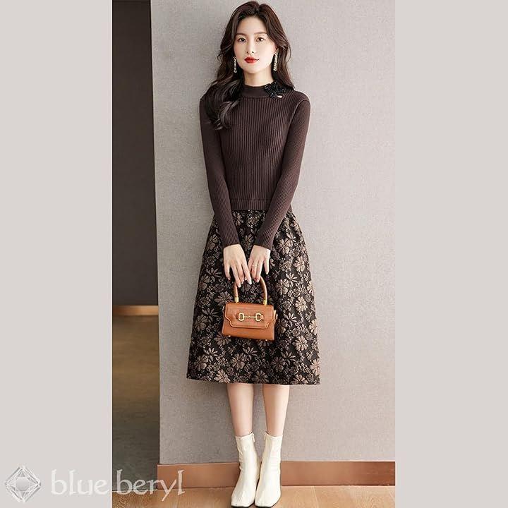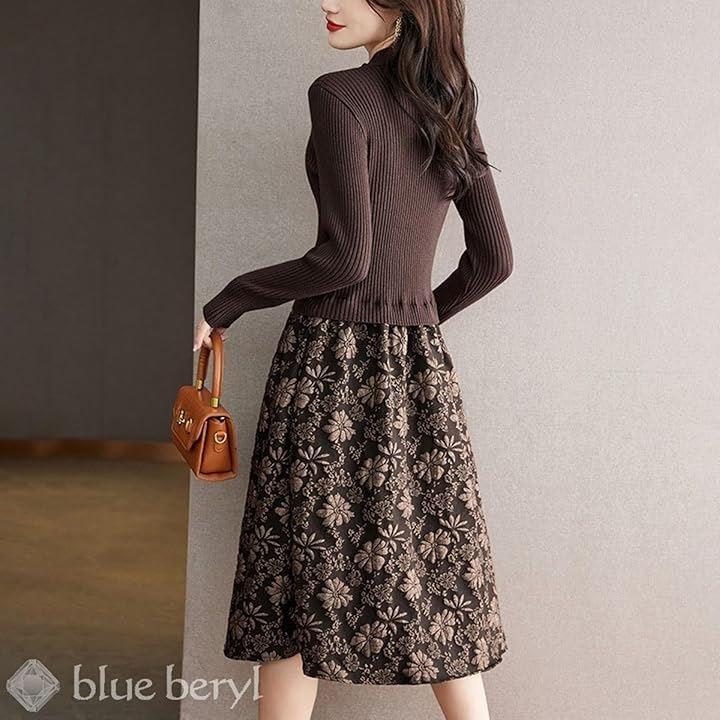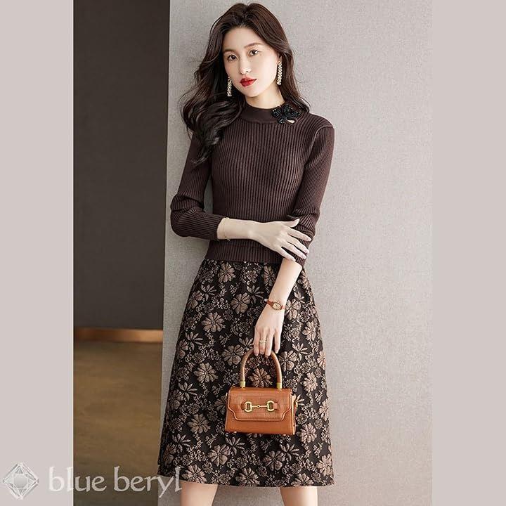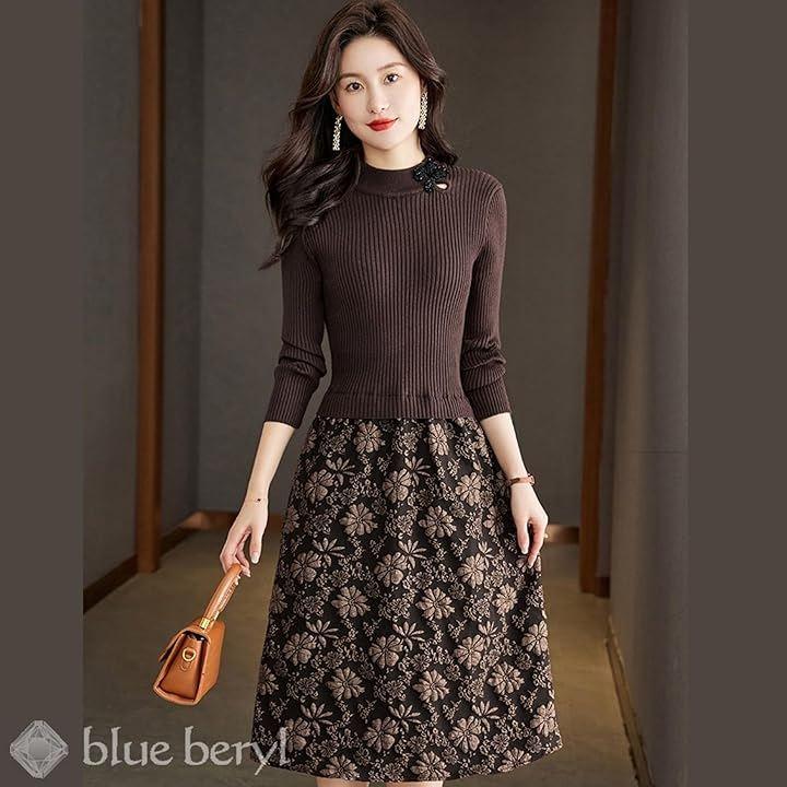 「異素材コンビネーションが立体感をプラス」 タイトなラインのリブニットトップスに、布帛のフレアスカートがドッキングしたようなワンピース。