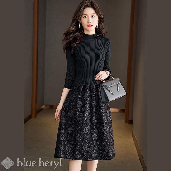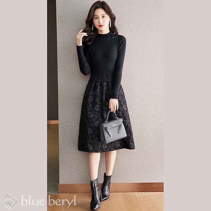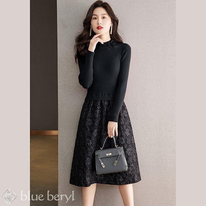 「異素材コンビネーションが立体感をプラス」 タイトなラインのリブニットトップスに、布帛のフレアスカートがドッキングしたようなワンピース。