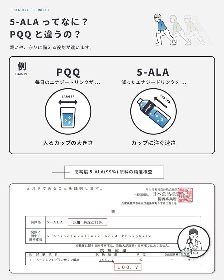 名称::5-ALA 含有食品原材料:NMN(国内製造)、5-ALA、ピロリン酸鉄/ビタミンC、結晶セルロース、 亜鉛含有酵母、ステアリン酸カルシウム、カープレックスFPS-500内容量:17.7g[1粒重量 295mgx60粒」賞味期限:パッケージに記載保存方法:直射日光及び高温多湿の場所を避けて保存してください。