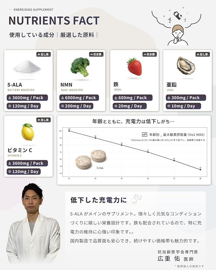 「エネルギッシュな毎日を応援」5-ALAだけでなく、NMNやビタミンC、亜鉛などもたっぷり配合されています。