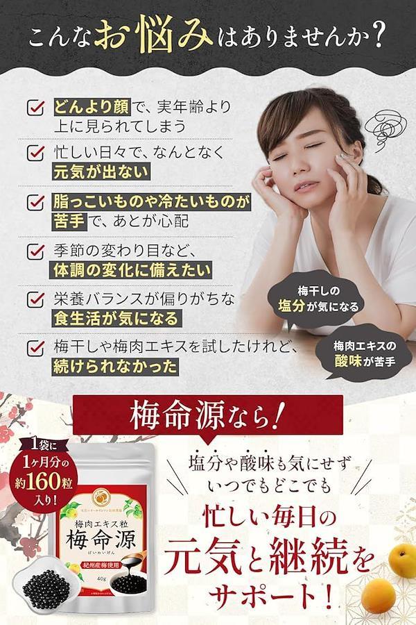 「このような方におすすめ」忙しい毎日で元気が出ない、体調管理が難しい、脂っこいものや冷たいものが苦手であとが心配、いつまでも若々しくいたい、食生活が気になるなど 濃縮した梅エキスが元気でイキイキとした毎日をサポートします。