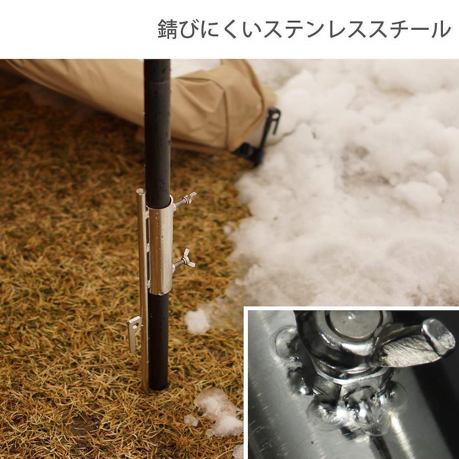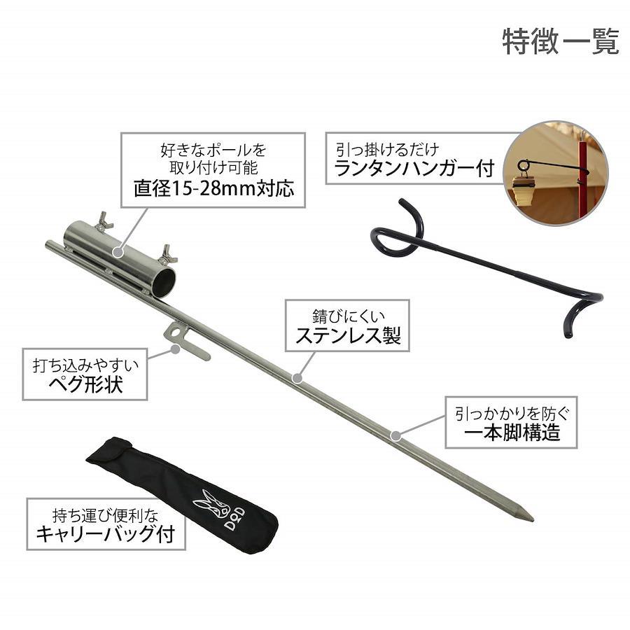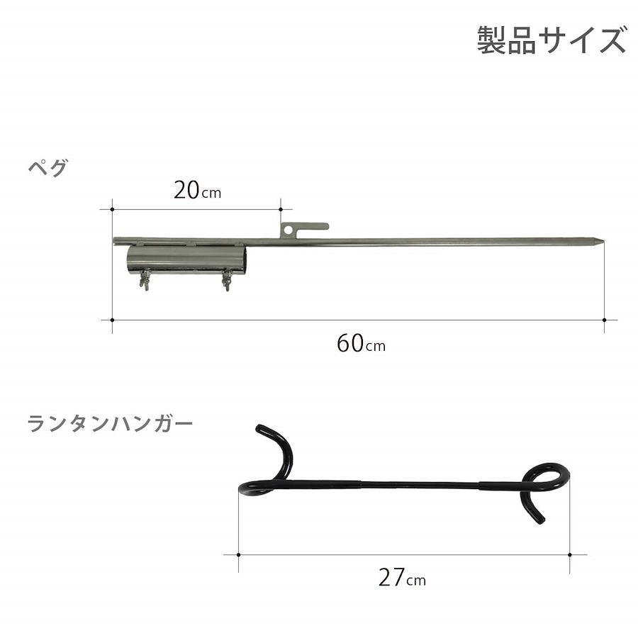 錆びにくいステンレススチール ※従来品からの変更点素材を 従来品のスチール からステンレススチールに変更しています。水分や土が付着しても錆びにくい仕様です。また、硬い地面に打ち込んでも壊れにくいように、ネジ部分の溶接を強化しました。サイズ(:約)W8×D3.5×H60cm ※ペグ部分のみ重量(付属品含む):(約)910g材質:ステンレス ※ペグ部分付属品:ランタンハンガー、キャリーバッグ※ ポールは付属しません。※ 燃料を使用するランタンや1kg以上の重いランタンを引っかける場合には、必ずビッグタープポール(XP5-507K/XP5-507R/XP5-507-WD)を使用し、近くに燃えやすいものを配置したり、人が近づかないようにしてください。※ 2kg以上のものを吊り下げないでください。※ どの程度の重さのものを吊り下げることができるかは接続するポールの強度や高さ、地面の状況により変動します。吊り下げた状態で安定しているかを確認した上で使用してください。
