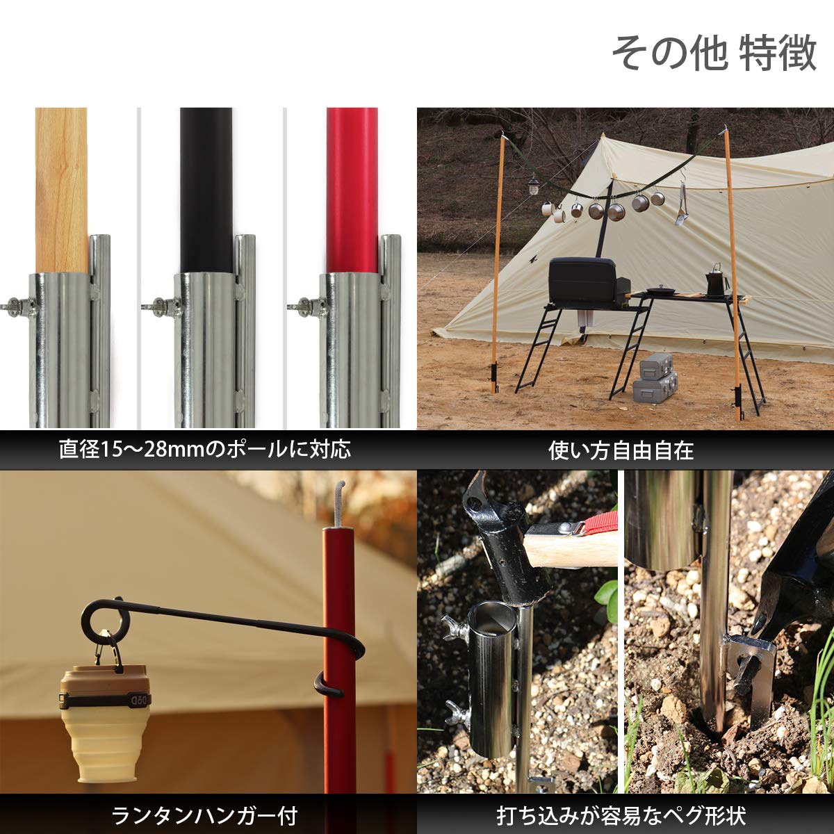 好きなポールを取付け可能直径15~28mmのポールを取り付けることができます。用途や好みに応じて、好きなポールを選ぶことができます。※燃料を使用するランタンや1kg以上の重いランタンを引っかける場合には、ビッグタープポール(XP5-507K/XP5-507R/XP5-507-WD)を使用してください。