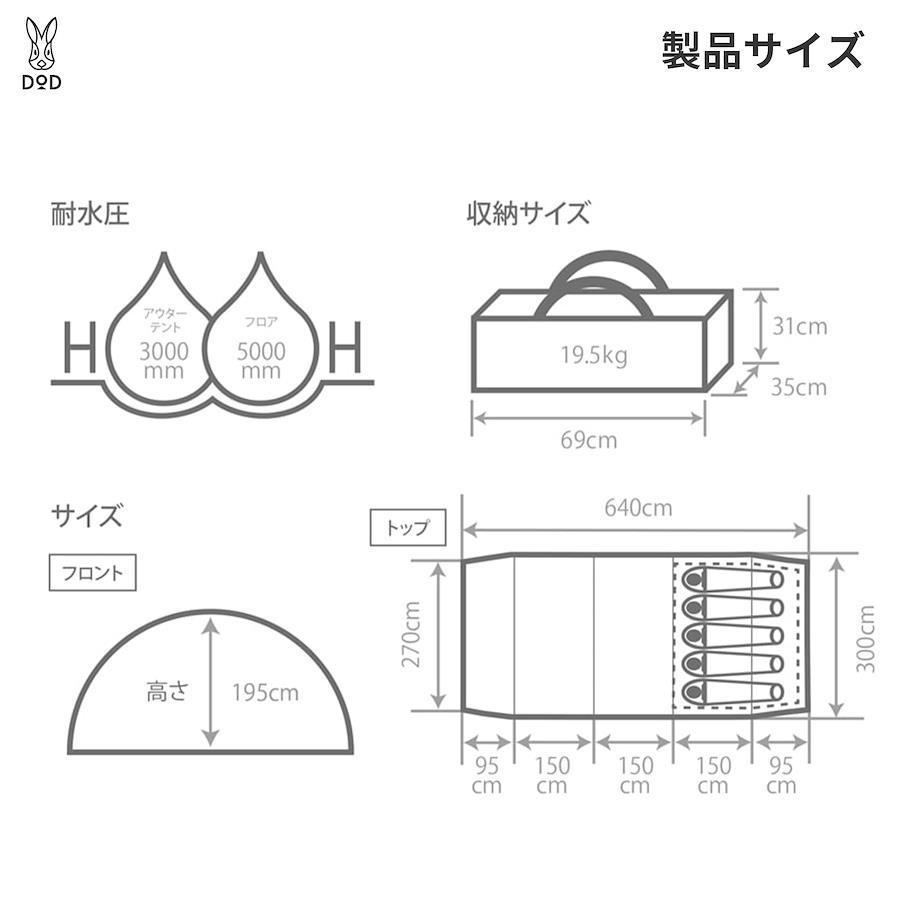 組立サイズ(外寸):(約)W300×D640×H195cmインナーサイズ:(約)W280×D220×H170cm収納サイズ:(約)W69×D35×H31cm重量(付属品含む):(約)19.5kg収容可能人数:大人5名(※寝室スペース)