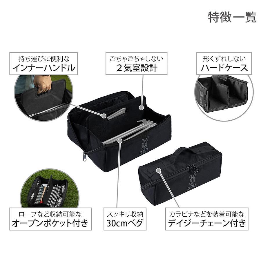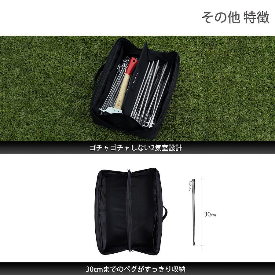 サイズ:(約)W35×D13×H17cm重量:(約)520g材質:表地:2520Dポリエステル(撥水・防汚加工)、裏地:210Dポリエステル(撥水・防汚加工)、クッション材:ポリエチレン静止耐荷重:約10kg鍛造ペグ30cmを40本、ハンマー2本とガイロープが収納可能。