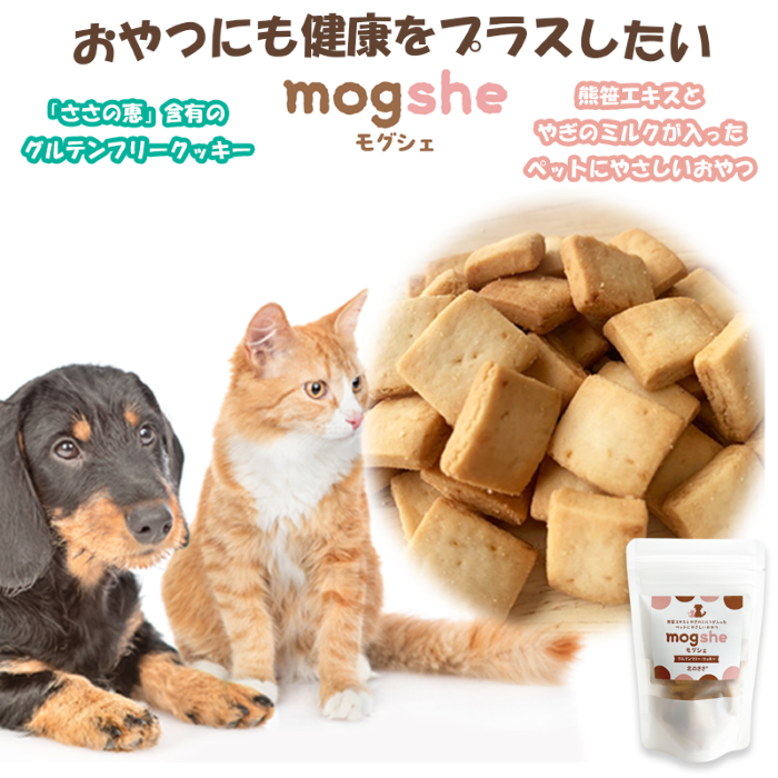 【mogshe モグシェ】■おやつにも健康をプラスしたい。そんな想いからできた「ささの恵」含有のグルテンフリークッキーです。■熊笹エキスとやぎのミルクが入ったペットにやさしいおやつです。■飼い主さまも一緒に食べられるクッキーです。■(mogshe モグシェ)・名称:犬・猫用クッキー・原産国:日本・原材料名:国産米粉、食用米油、甜菜含蜜糖、液卵、ヤギミルク、クマザサエキス・内容量:30g・賞味期限:枠外記載(製造日より1年)・保存方法:直射日光、高温多湿を避けて保管してください。