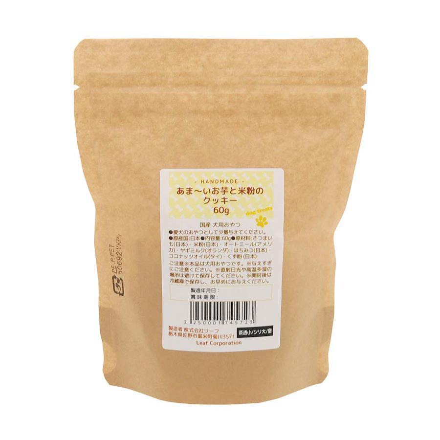素材にこだわったサクサクのハンドメイドクッキー体にやさしい素材を選び、全てハンドメイドでていねいに仕上げたワンちゃん用のクッキーです。糖度は高くても低カロリーなさつまいもと米粉、くず粉、オートミールに、タウリンが豊富で低アレルゲンなヤギミルク、飽和脂肪酸が多く含まれるココナッツオイル、やさしい甘さの国産はちみつをプラス。無添加・無着色・保存料不使用なので安心です。オーブンで焼き上げているためパリパリの食感で、噛むことによってワンちゃんも満足。おやつに、ごほうびに、ワンちゃんと一緒に過ごす楽しい時間にピッタリなプレミアムクッキーです。あま~いお芋と米粉のクッキー60g国産犬用おやつハンドメイド対象全犬種機能おやつライフステージオールステージ(生後6ヶ月以上)特長●甘くてヘルシーなお芋と米粉のワンちゃん用クッキーです。●素材にこだわったハンドメイド。国産や外国産オーガニックの原材料を厳選して使用しています。●オーブンで焼き上げてパリッと仕上げました。●ココナッツオイルは、コレステロール・トランス脂肪酸を含まず、飽和脂肪酸を多く含み、酸化に強くエネルギーになりやすいオイルです。●無添加・無着色・保存料不使用です。●やさしい甘さの国産はちみつ入り。●保存に便利なチャック付き袋に入っています。内容量60g原材料さつま芋、米粉、オートミール、ヤギミルク、はちみつ(国産)、ココナッツオイル、くず粉原産国日本与え方●愛犬のおやつとして少量与えてください。保存方法●直射日光や高温多湿の場所を避けて保存してください。●開封後は必ず封をして冷蔵庫で保存し、消費期限に関わらず早めにお与えください。ご注意※6ヶ月未満の幼犬には与えないでください。※製品表面の白い粉状のものは米粉となります。カビではございませんのでご安心ください。※製品内に黒く見える部分がございますが、安納芋の皮の部分です。※本品を与える際は、喉に詰まらせないよう様子を見ながら与えてください。※風通しの良い、直射日光があたらない涼しいところで保管してください。※本品は保存料を使用しておりません。消費期限内でも保管状況によっては、カビが発生する場合がございます。開封後は冷蔵庫で保存しお早目にお与えください。※本品はハンドメイドですので、原料の仕入れ時期によって、クッキーの色や硬さにムラがある場合がございます。予めご了承ください。