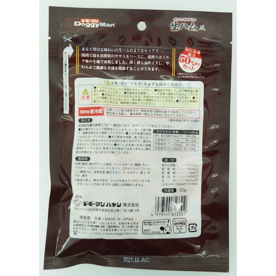 ・ササミとミルクの風味で愛犬大満足、ルックスも楽しいごほうびスナック。・鶏肉の中で最も低脂肪のササミをベースに霜降りに見える部分はミルク味で表現。与えるときも楽しいルックス。・薄く薄くスライスし、やわらかで繊細な食感に愛犬も大満足。・少量でも満足感の得やすいボリューム。