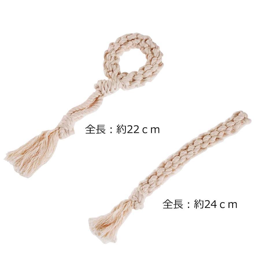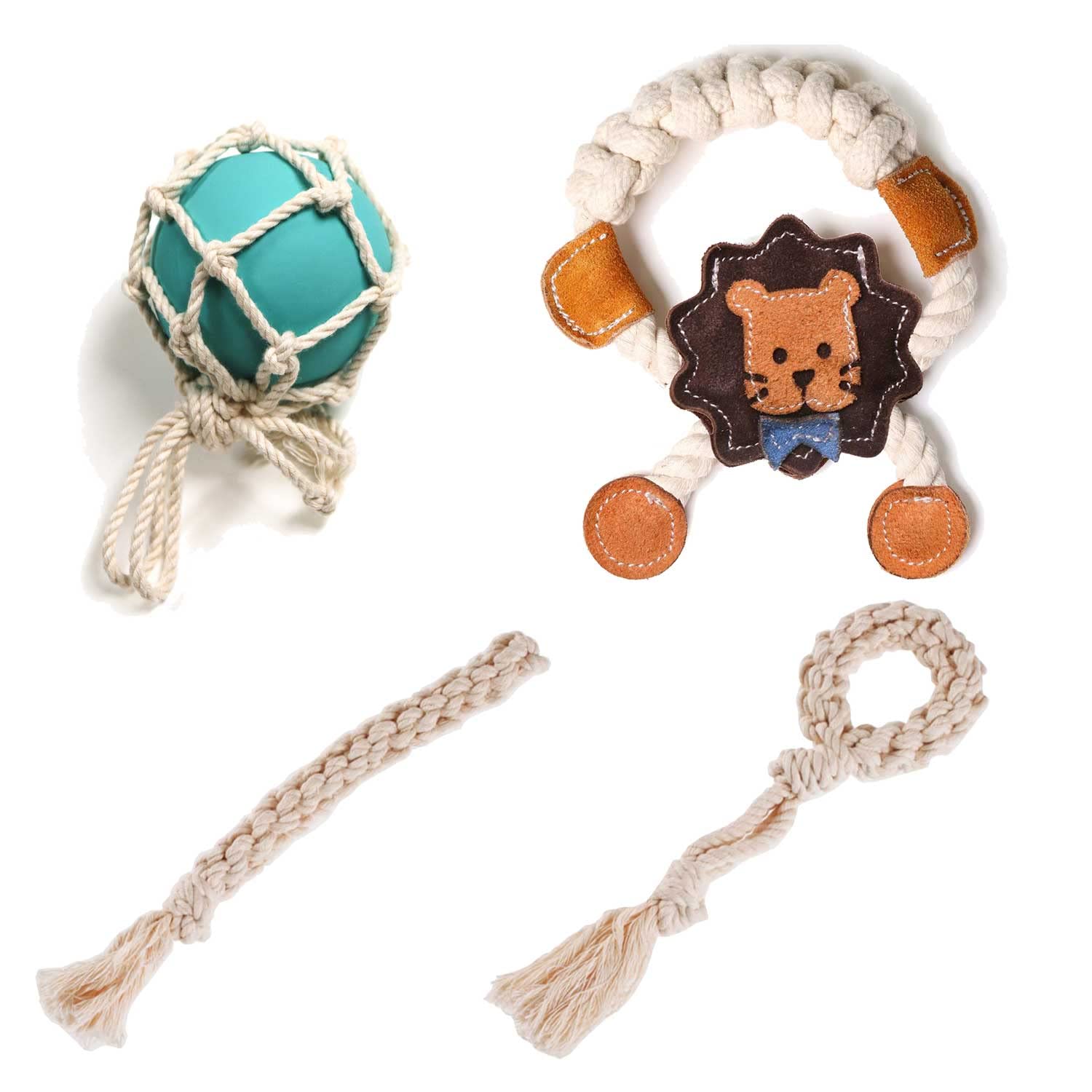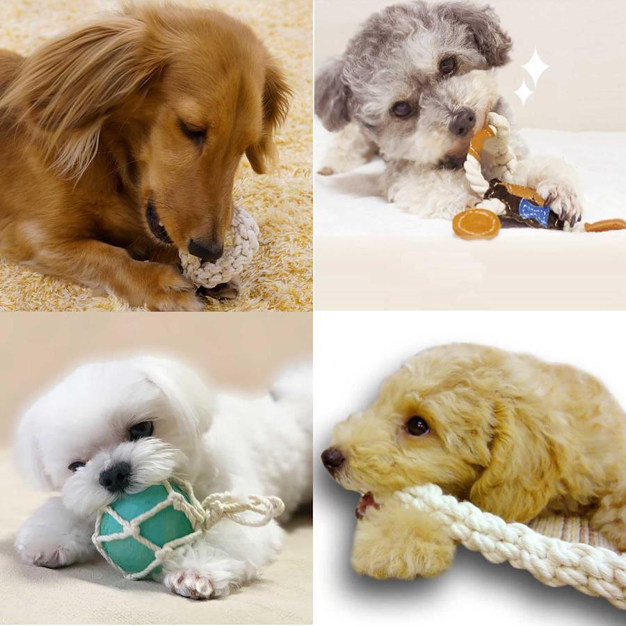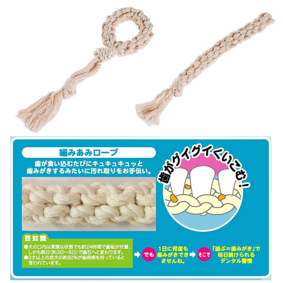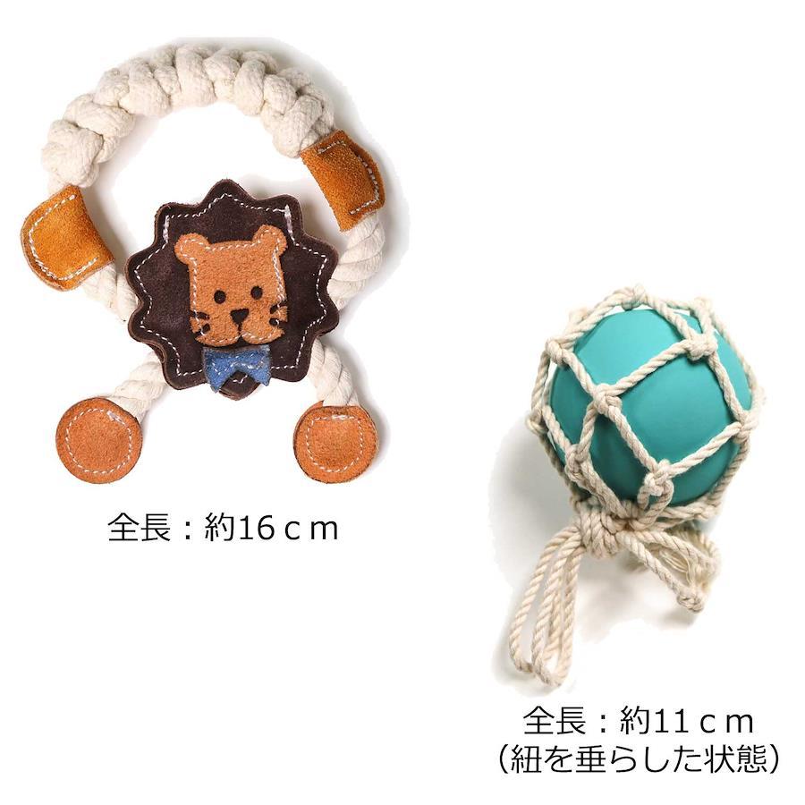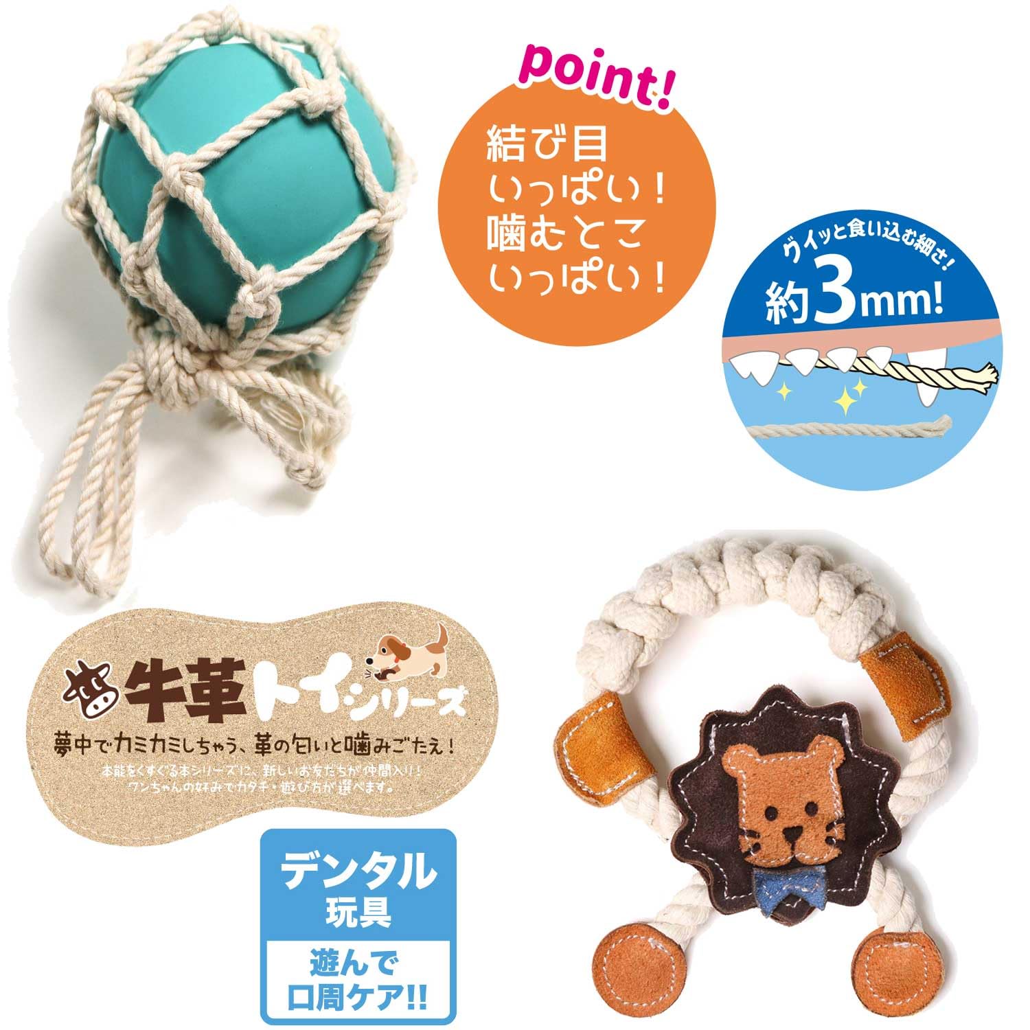 ラテックスの笛入りボールに極細ロープをまとわせたハミガキ玩具。野生のニオイ残った牛革とコットンロープを使用した見た目もかわいいライオン型おもちゃ。コットン糸だけで編み込んだカミカミ玩具2種類。遊びながらカミカミする事で、歯と歯茎のケアを。