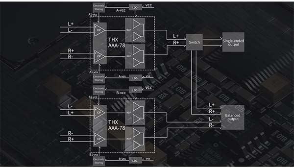 ESS Technology製ハイスペック2ch DACチップ「ES9068AS」を2基、左右独立構成で搭載PCM384kHz/32bit,DSD256/1bitの再生に対応THXの特許技術アンプテクノロジー「AAA-78」アンプを2基搭載Qualcomm製8コアSoC「Snapdragon 660」によるスムーズな動作強固なシールドで基板間干渉を抑制するモジュール型設計