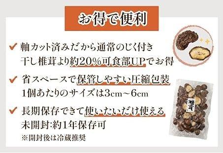 干ししいたけのじく部分をあらかじめ取り除いているため、1袋あたりの可食部が多く、通常のじく付き乾燥椎茸よりも20%以上枚数が多くなるというお得感も魅力です。