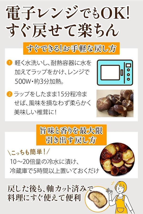 電子レンジでも簡単に戻せる調理のしやすさ 干し椎茸は通常、水で時間をかけて戻す必要がありますが、本商品は電子レンジでも簡単に戻すことが可能です。