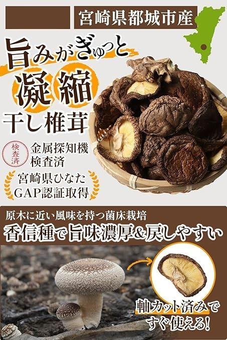 宮崎県都城市産干し椎茸 この干し椎茸は、全国でも有数の椎茸生産地である宮崎県都城市で丁寧に育てられた、純国産の乾燥しいたけです。