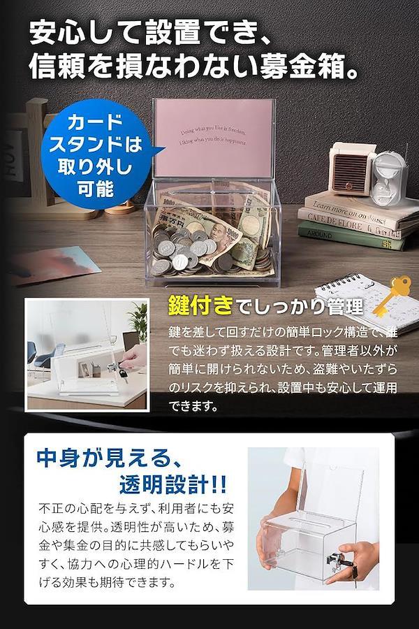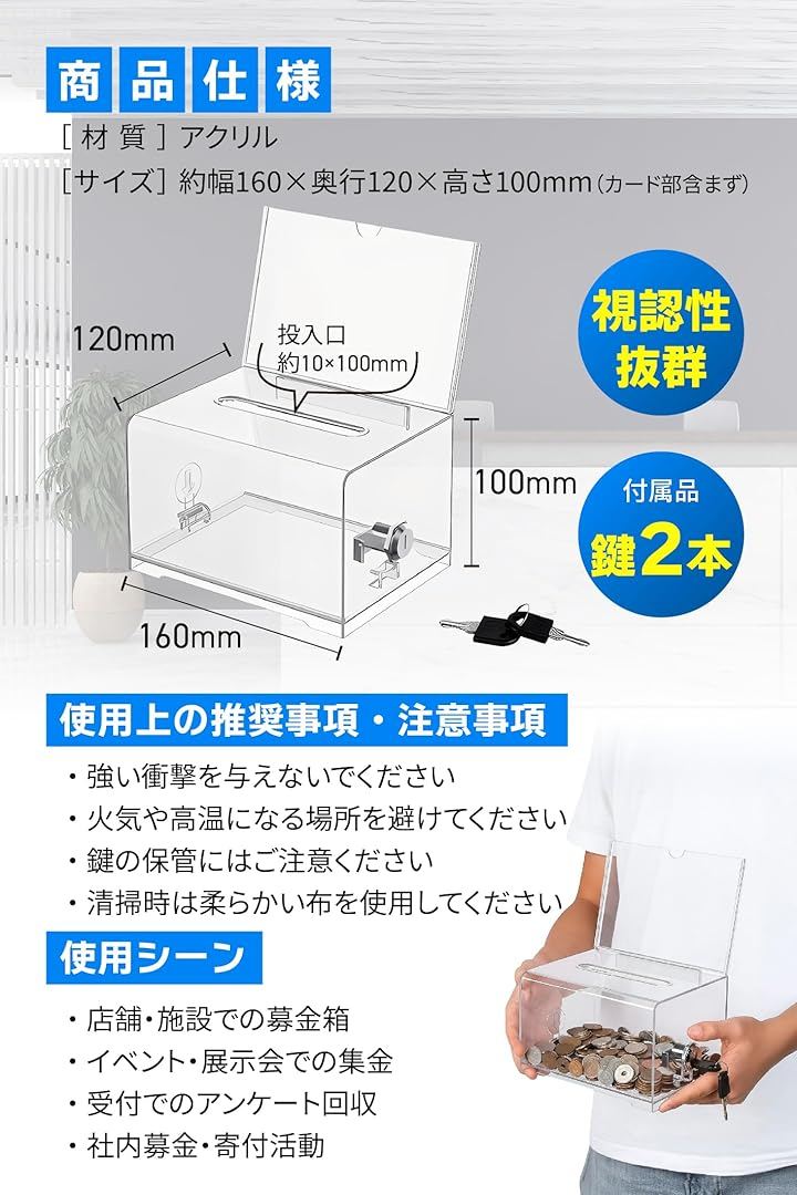 「商品仕様」 素材:アクリル/サイズ:約幅160x奥行120x高さ100mm(カード部含まず)/投入口:約10x100mm/セット数:1個・2個セット/付属品:鍵2本/カラー:クリア