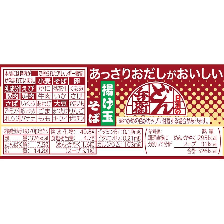 油揚げめん(小麦粉(国内製造)、そば粉、植物油脂、食塩、植物性たん白、しょうゆ)、スープ(糖類、食塩、かつおぶし調味料、粉末しょうゆ、魚粉(かつお、そうだかつお、いわし)、オニオン調味料、ねぎ、たん白加水分解物、デキストリン、香辛料)、かやく(揚げ玉、味付卵、かまぼこ、わかめ)/加工でん粉、調味料(アミノ酸等)、リン酸塩(Na)、カラメル色素、炭酸Ca、香料、酸味料、酸化防止剤(ビタミンE)、乳化剤、増粘多糖類、ベニコウジ色素、チャ抽出物、カロテン色素、ビタミンB2、クチナシ色素、ビタミンB1、(一部にえび・小麦・そば・卵・乳成分・さば・大豆・鶏肉・豚肉を含む)