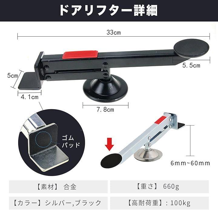 「商品内容」: ドアリフター「カラー」: シルバー,ブラック「サイズ」: 33x7.8cm「高耐荷重」: 100kg「重さ」: 660g「素材」: 合金