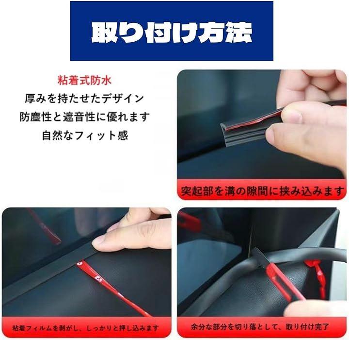 取り付け方法は(1)突起部を溝の隙間に埋め込みます(2)粘着フィルムを剥がし、しっかりと押し込みます(3)余計な部分をカットして、取付完了、です。