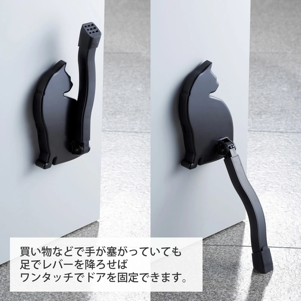 【商品情報】買い物などで手が塞がっていても足でレバーを降ろせばワンタッチでドアを固定できます。猫のデザインのマグネット式ドアストッパーです。スチール製、木製、アルミ製など様々なドアに設置可能です。シンプルでかわいい猫のデザインで玄関のアクセントにぴったりです。日本製