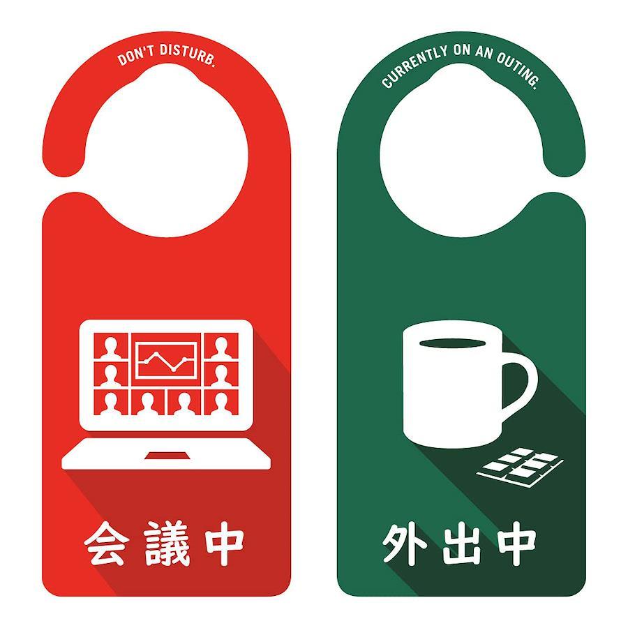 ドアノブにかけてつかえるサインプレート。両面デザインタイプ。表側:会議中 / 裏側:外出中 オフィスやご自宅でご利用ください。表が赤、裏が緑とはっきりとした色でオンオフを切り替えを意識して過ごせるプレートです。職場での会議室に。ご自宅でのテレワーク、オンラインミーティング、zoomミーティングなどでもご利用いただけます。 材質: ユポ紙+特殊加工 ※ユポ紙は「森林資源保護」を目的に開発された耐水性に優れた丈夫な合成紙です。さらに特殊加工を施し適度な厚みと耐久性を加えました。【ご注意】・ドアの形状、サイズをご確認のうえ、ご購入ください。・お使いのモニターの設定、お部屋の照明等にもより、実際の商品と色味が異なる場合がございます。・鋭利なものでこすりますと、傷がつく場合がございます。