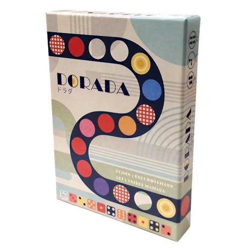「ドラダ」はコマ4個持ちのすごろくゲームです。シンプルながら工夫に満ちたルールが、悩ましくも楽しい駆け引きをもたらします。サイコロを振り、自分のコマから1個選んで進める他のコマに踏まれているコマは動かせない途中の穴に落ちたコマは脱落してしまうより「遅く」ゴールに入ったコマが高得点!