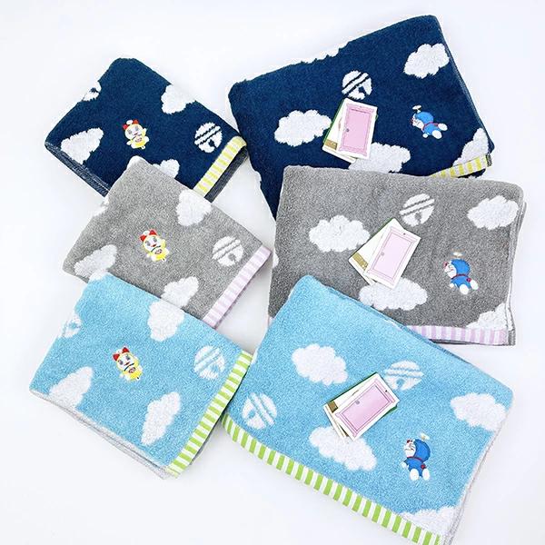 タオル一面が空のデザインとなっており、タケコプターで飛んでいるドラえもんのアップリケが可愛いフェイスタオルです。ふわふわした無撚糸で触りごごちの良いボリュームのあるタオルに仕上がっています。サイズ違いをセットにしてお祝いごとの贈り物にもオススメです。