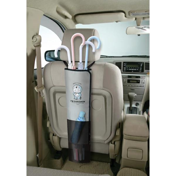 傘が最大5本収納可能で、ポケットには折りたたみ傘やジュニア傘を収納できます。ケース端からの開閉で、傘の出し入れがスムーズに出来ます。面ファスナー付きベルトでヘッドレストポールに簡単に取り付けできます。簡単に取り外しが出来、持ち運び出来るので、玄関等でのご使用も出来ます。溜まった水はポケットを外して簡単に捨てられます。