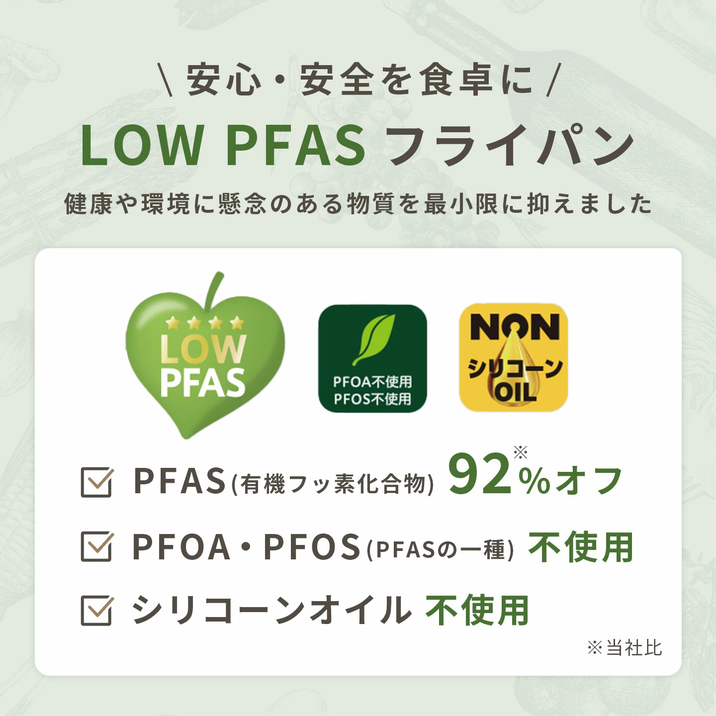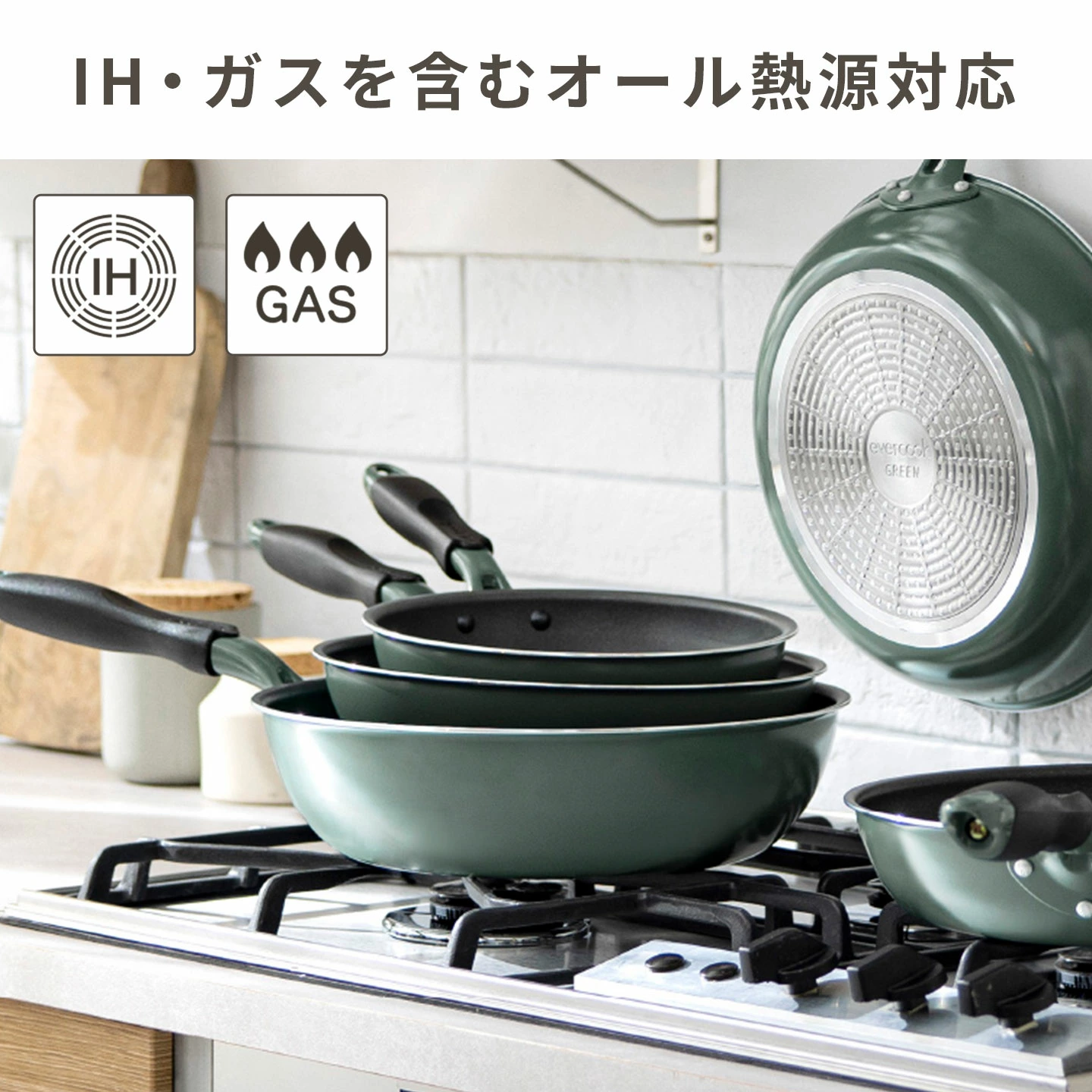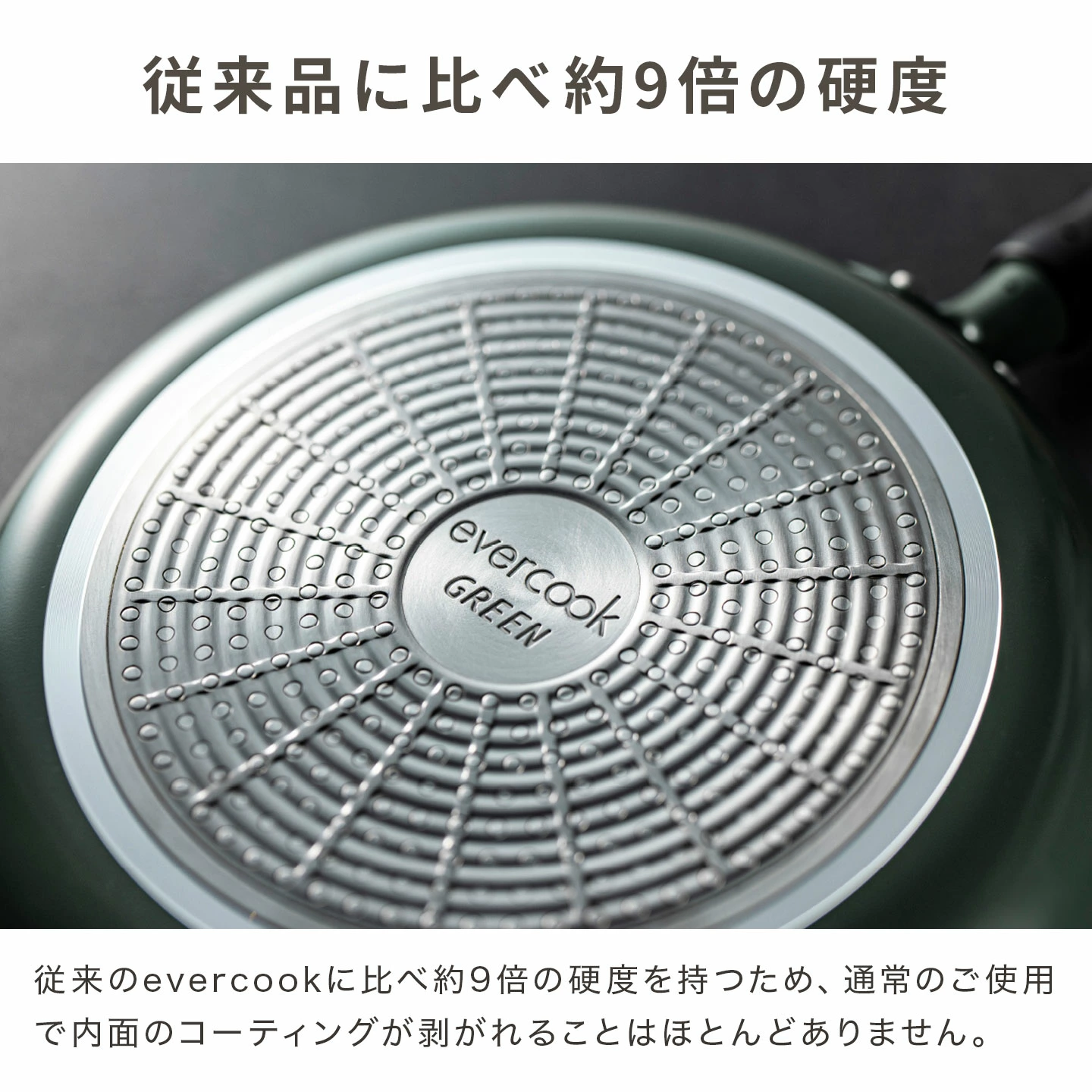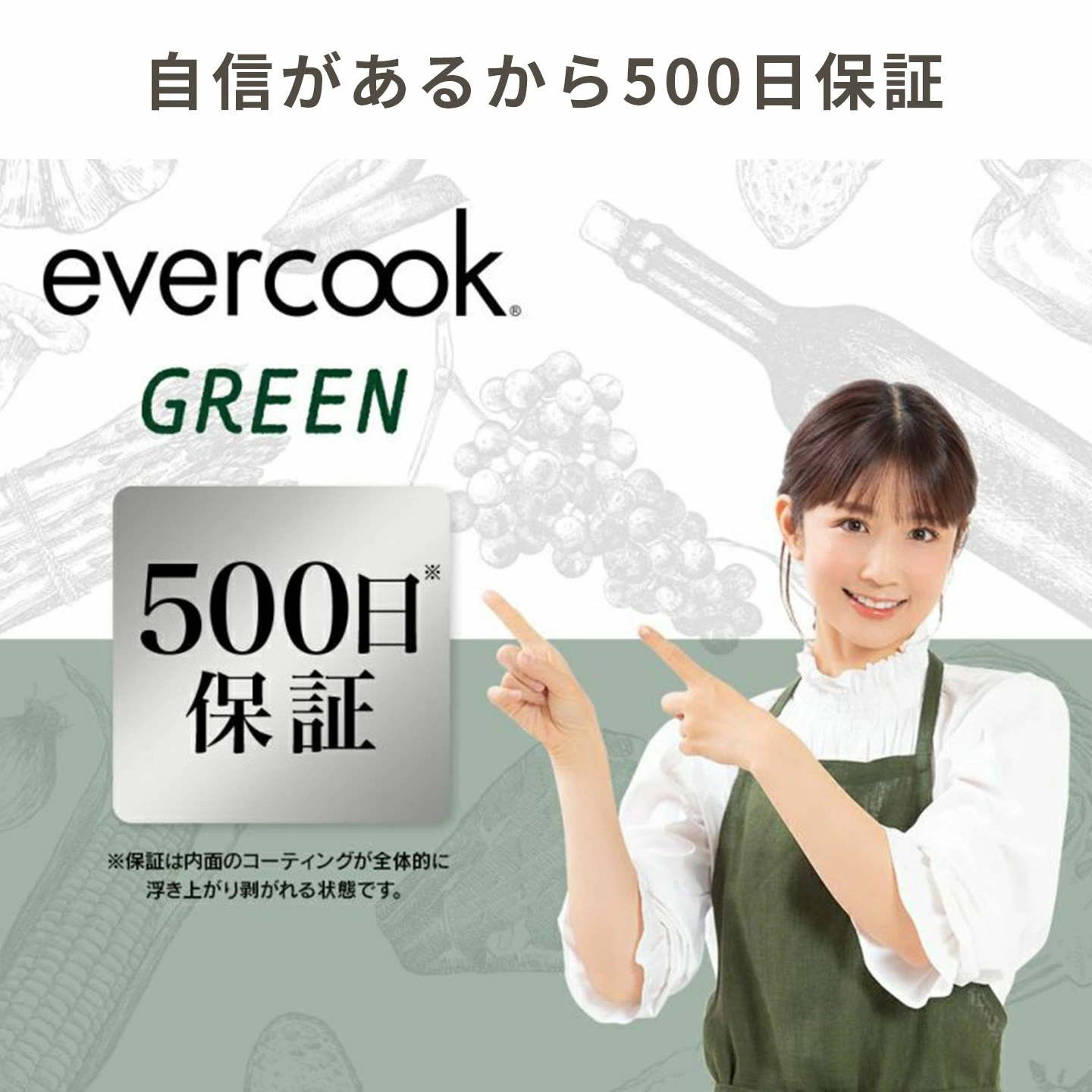 【evercook GREEN フライパン】使いやすさと健康への配慮を両立した「ever cook GREEN(エバークック グリーン)」。フッ素樹脂コーティングフライパンの使いやすさをそのままに、身体にも環境にも優しいLOW PFASフライパンです。「PFAS(ピーファス)」とは人工的につくられた有機フッ素化合物の総称です。現在、健康や環境への影響が懸念されています。このフライパンでは従来品と比較して、PFASを約92%カット。さらに、強耐久なPEEK樹脂コーティングで、使いはじめの滑らかさがずっと続きます。コーティングの強さから、本体内面のコーティングの剥がれに対して「500日保証」付き。安心して長くご使用いただけます。