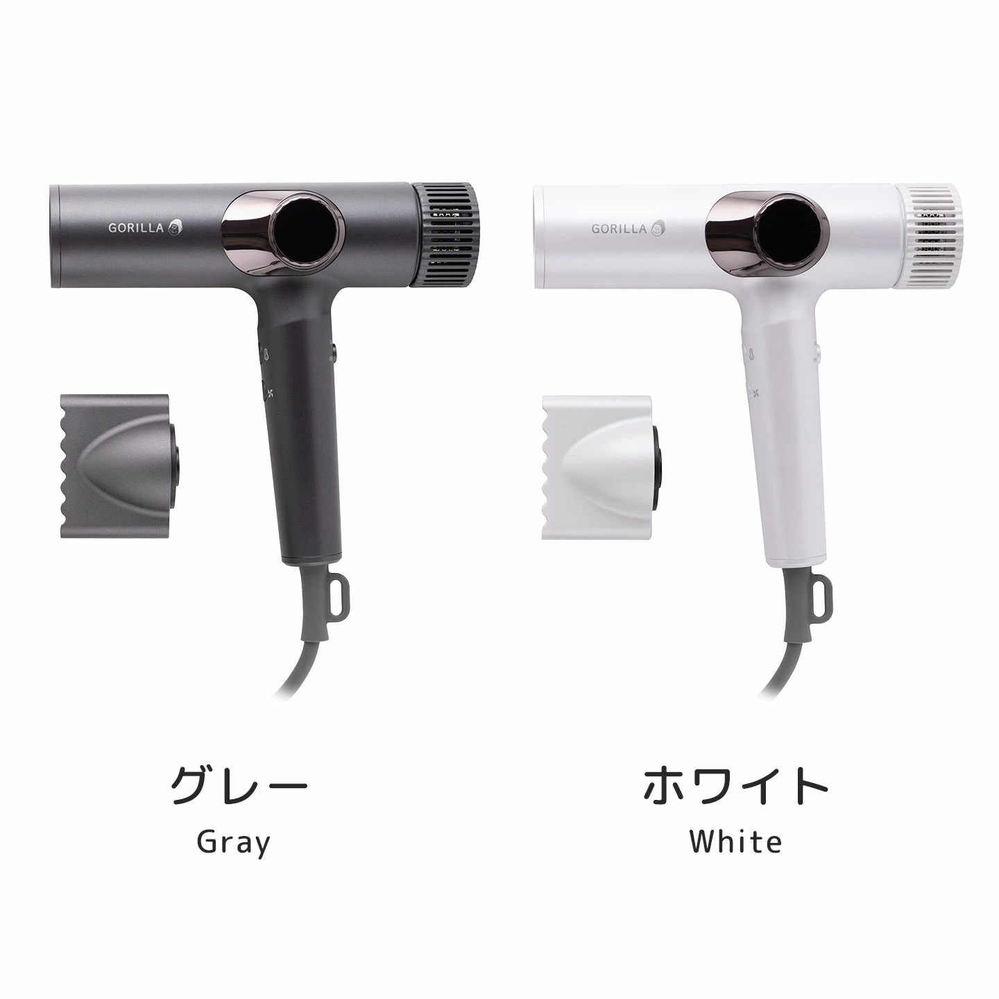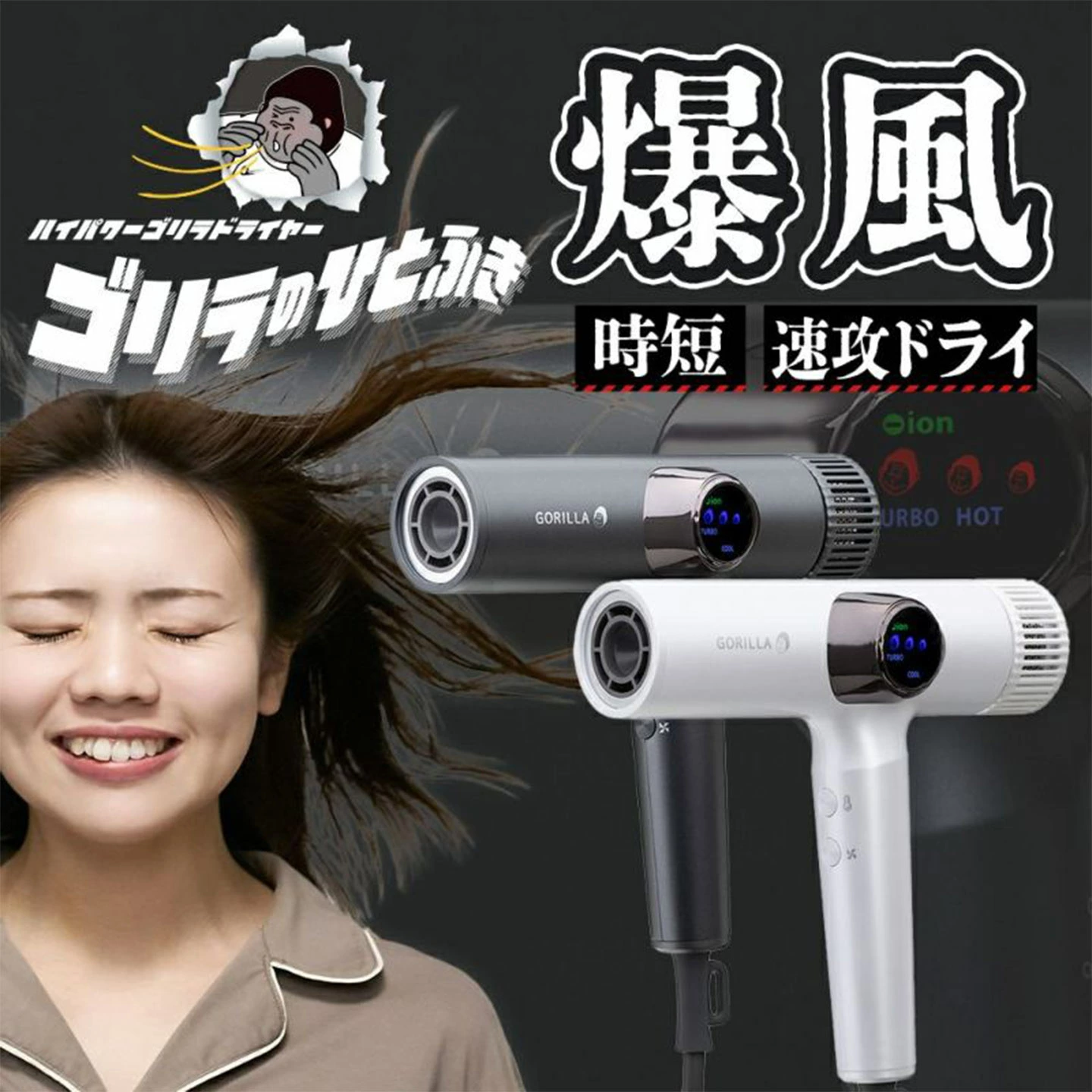 【ゴリラのひとふき】その風、まさにゴリラ級!SNSでも話題のゴリラのハイパワーシリーズに超強力モーター搭載のドライヤーが新登場。最大風速63.91m/sの大風量で髪を乾かす時間を大幅時短。さらにたっぷりマイナスイオンや手間要らずのリズムモード(冷温自動切り替え機能)でしっとりなめらかな美髪もキープ。わかりやすいゴリラ柄のLED表示や3段階の風量、温度調整など機能性も抜群です。本体は軽量で扱いやすく、フィルターを外して水洗いも可能。プレゼントにも喜ばれるアイテムです。