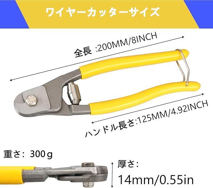 ワイヤーロープカッター情報:「切断能力」ワイヤー:4.0mmφ「硬度HRC」刃部:62「重量」300g「全長」200mm