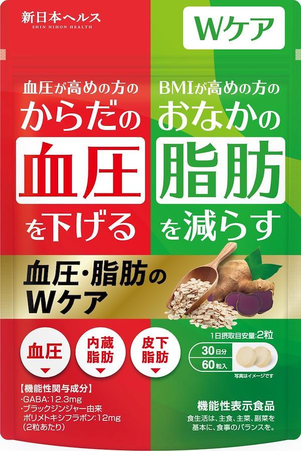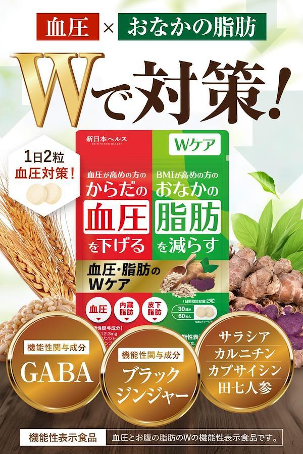 ■サイズ:??16.5x11x2cm;20g ?【血圧と脂肪をWでケア】高め血圧を下げるサプリ&BMI高めの方の脂肪を減らすサプリです!GABAとブラックジンジャーを配合したWの機能性表示食品です。 ?【高めの方の血圧を下げる】本品にはGABAが含まれます。GABAは、血圧が高めの方の血圧を低下される機能があることが報告されています。 ?【BMI高めの方の脂肪を減らす】本品にはブラックジンジャー由来ポリメトキシフラボンが含まれます。ブラックジンジャー由来ポリメトキシフラボンは、日常活動時のエネルギー代謝において、脂肪を消費しやすくする機能があることが報告されています。またBMIが高めの方のお腹の脂肪(内臓脂肪と皮下脂肪)を減らす機能があることが報告されています。 ?【国内GMP製造】安心・安全に徹底してこだわり、国内のGMP認定工場で製造しております。 ■重要なお知らせ