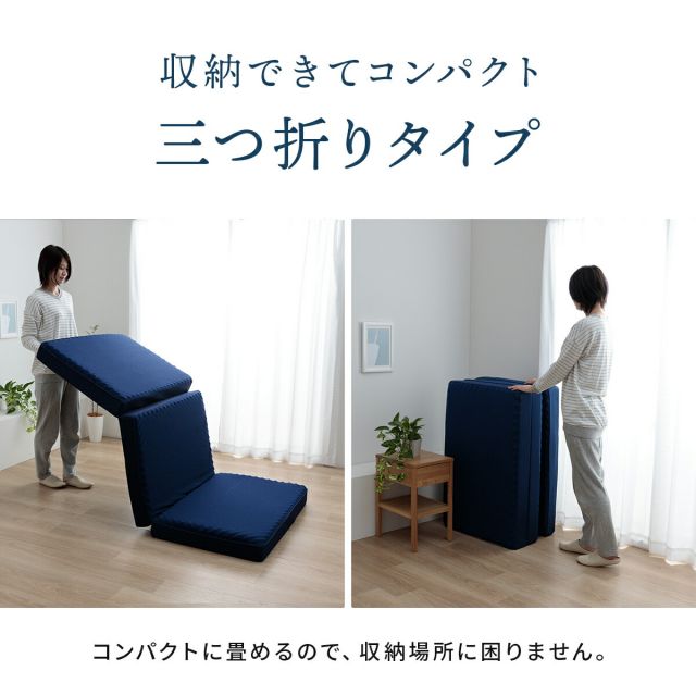 高反発180Nプロファイルウレタン使用のマットレスです。プロファイルウレタンは、凸凹の波型が特徴で、凸の部分で身体を支えます。また、通気性も良いです。マットレスの厚みは約12cmで、底つき感もありません。カバーには抗菌・防臭加工を施しています。カバーは、洗濯機での丸洗いも可能です。通気性と速乾性に優れたメッシュ生地です。カバーは着脱が簡単なL字ファスナー仕様です。三つ折りタイプのマットレスのため、コンパクトに収納できます。