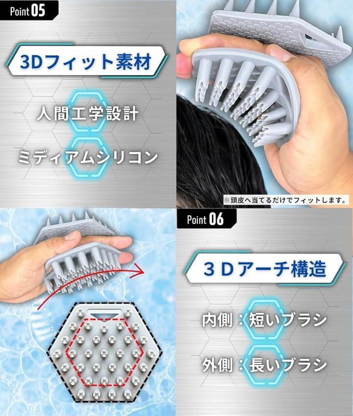 「3Dアーチ構造」内側は短いブラシ、外側は長いブラシを採用。すべてのブラシが頭皮に密着。