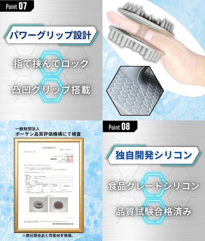 「パワーグリップ設計」指で挟んでロック。凹凸グリップも搭載。泡で滑らないシャンプーブラシ。